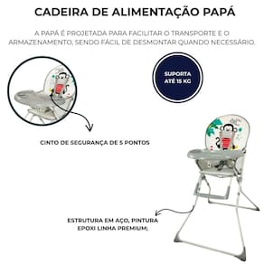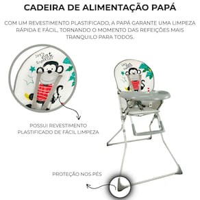 Cadeira alta de alimentação infantil papá cinza macaco Cadeira alta de alimentação infantil cinza macaco Código: hc15d Com um revestimento plastificado, a papá garante uma limpeza rápida e fácil, tornando o momento das refeições mais tranquilo para todos. Equipada com proteção lateral e um cinto de segurança de cinco pontos, a papá oferece um ambiente seguro e confortável para o seu bebê durante as refeições. Com uma estrutura em aço e pintura epóxi de linha premium, a papá combina durabilidade com um design elegante, garantindo que ela se adapte perfeitamente a qualquer ambiente. A bandeja com porta-copos oferece espaço para os utensílios essenciais do seu bebê, enquanto o apoio de pés com três posições de ajuste garante conforto adicional durante as refeições. Com uma trava de segurança, a papá oferece tranquilidade aos pais, garantindo que a cadeira permaneça estável durante o uso. A papá é projetada para facilitar o transporte e o armazenamento, sendo fácil de desmontar quando necessário. Principais características: Possui revestimento plastificado de fácil limpeza; Proteção lateral; Possui cinto de segurança 5 pontos Estrutura em aço, pintura epóxi linha premium Bandeja com porta-copos Apoio de pés com 3 posições de ajuste Trava de segurança Fácil desmontagem Capacidade máxima 15 kg Registro do produto no inmetro: 003348/2023 Dimensões: - medida da cadeira aberta: 100x43x74 axlxp : 12 meses direto com o fabricante Marca: Não Informado Ean: 7908488102861