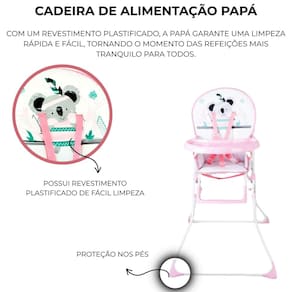 Cadeira alta de alimentação infantil papá rosa coala Cadeira alta de alimentação infantil rosa coala Código: hc15d Com um revestimento plastificado, a papá garante uma limpeza rápida e fácil, tornando o momento das refeições mais tranquilo para todos. Equipada com proteção lateral e um cinto de segurança de cinco pontos, a papá oferece um ambiente seguro e confortável para o seu bebê durante as refeições. Com uma estrutura em aço e pintura epóxi de linha premium, a papá combina durabilidade com um design elegante, garantindo que ela se adapte perfeitamente a qualquer ambiente. A bandeja com porta-copos oferece espaço para os utensílios essenciais do seu bebê, enquanto o apoio de pés com três posições de ajuste garante conforto adicional durante as refeições. Com uma trava de segurança, a papá oferece tranquilidade aos pais, garantindo que a cadeira permaneça estável durante o uso. A papá é projetada para facilitar o transporte e o armazenamento, sendo fácil de desmontar quando necessário. Principais características: Possui revestimento plastificado de fácil limpeza; Proteção lateral; Possui cinto de segurança 5 pontos Estrutura em aço, pintura epóxi linha premium Bandeja com porta-copos Apoio de pés com 3 posições de ajuste Trava de segurança Fácil desmontagem Capacidade máxima 15 kg Registro do produto no inmetro: 003348/2023 Dimensões: - medida da cadeira aberta: 100x43x74 axlxp : 12 meses direto com o fabricante Marca: Não Informado