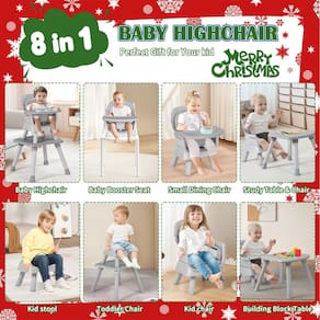 Kinder King Cadeira alta para bebê, cobertor 8 em 1 para assento elevatório/conjunto de mesa e cadeira para crianças/mesa de blocos de montar para crianças/banco infantil, bandeja removível e capa de assento duplo, cinza e branco - Cadeira alta multifuncional: esta cadeira alta se converte facilmente em vários modos: cadeira alta tradicional, assento elevatório de bebê, mesa e cadeira de estudo infantil, mesa de blocos de construção e banco infantil; Recomendado para idades: 6-36 meses (até 25 kg) - Booster conversível: adequado para uso como assento de chão, cadeira de alimentação de bebê ou assento elevatório infantil em uma mesa no lugar de uma cadeira alta; cintos de segurança ajustáveis; conforme seu filho cresce, o booster também pode ser convertido em um banquinho infantil - Bandeja ajustável: bandeja ajustável de três posições para acomodar bebês de diferentes formas corporais; feita de material PP de alta qualidade, a bandeja é ideal para alimentar ou comer e pode ser lavada na lava-louças. Serve como uma área de brinquedo - Design estável e seguro: inclui um arnês ajustável de cinco pontos com ombreiras; defletor de segurança fixo; a estrutura triangular sólida e o tubo de aço firmemente conectado evitam agitação excessiva ou movimentos bruscos - Fácil de instalar e limpar: com instruções detalhadas, a cadeira alta é fácil de montar. A capa de assento duplo é removível e fácil de limpar; escolha ideal para presentes de Natal, aniversários, chás de bebê e outras ocasiões