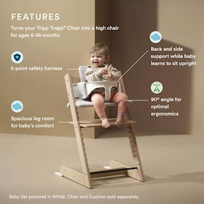 - Uma cadeira para a vida toda: a cadeira Tripp Trapp pode suportar até 136 kg, para que seu filho possa usá-la para sempre. Assim que crescerem mais do que o Baby Set 2, basta removê-lo e ajustar o suporte para as costas e os pés da cadeira para alcançar o ângulo ergonômico ideal.
