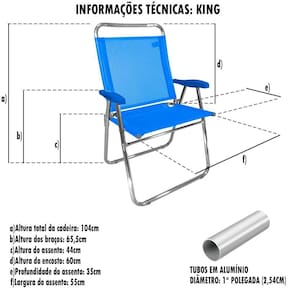 A Cadeira King ZAKA tem seus principais diferenciais o conforto e resistência por ser mais alta e mais larga é indicada para pessoas com até 140 kg, mais altas ou com sobrepeso. Fabricada em alumínio de alta resistência e que não enferruja, tecido BMDNET, soldado eletronicamente, sem costuras. Assento duplo. Atende perfeitamente públicos PLUS SIZE e OVERSIZE. Possui proteção que não risca o chão. Além disso, pode ser utilizada em diversos ambientes, como praia, camping e jardim, proporcionando ótimos momentos de lazer. Diferencial: a marca ZAKA é reconhecida por ser uma marca de qualidade. Todos os produtos são revisados e testados. A cadeira King é muito maior e muito mais resistente. Utilizamos os melhores componentes e insumos do mercado.