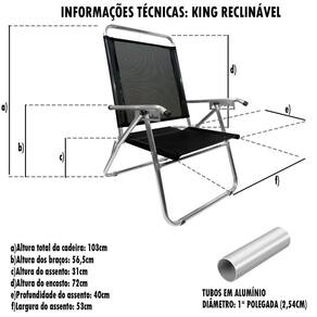 A Cadeira King Reclinável ZAKA tem seus principais diferenciais o conforto e resistência por ser mais alta e mais larga é indicada para pessoas com até 140 kg, mais altas ou com sobrepeso. Fabricada em alumínio de alta resistência e que não enferruja, tecido BMDNET, soldado eletronicamente, sem costuras, possui 5 posições, braços de alumínio. Assento duplo. Atende perfeitamente públicos PLUS SIZE e OVERSIZE. Possui proteção que não risca o chão. Além disso, pode ser utilizada em diversos ambientes, como praia, camping e jardim, proporcionando ótimos momentos de lazer. Diferencial: a marca ZAKA é reconhecida por ser uma marca de qualidade. Todos os produtos são revisados e testados. A cadeira King Reclinável é muito maior e muito mais resistente. Utilizamos os melhores componentes e insumos do mercado.