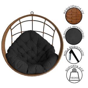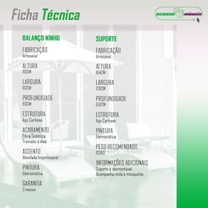 Marca: Acesse Moveis; Modelo: Balanco Suspenso Ninho; Material da Estrutura: Aco Carbono; Acabamento: Fibra Sintetica; Material do Assento: Tecido Impermeavel; Enchimento do Assento: Espuma flocada; Acompanha Almofada? Somente a almofada do assento; Garantia: 3 meses; Suporta Ate (kg): 120kg; Necessita de Montagem?(Sim/Nao): Sim, necessita somente de um encaixe; Medidas (LarguraxProfundidadexaltura): 110x93x110; Possui Corrente? Acompanha mola e mosquetao;