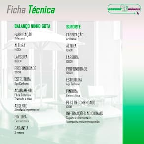 Independentemente de voce desejar criar um oasis de descanso em seu jardim, adicionar um toque especial a sua varanda ou proporcionar um local agradavel para relaxar em sua area externa ou escritorio, o Balanco Suspenso Ninho Gota e a escolha perfeita para voce. Experimente o conforto incomparavel, a elegancia duradoura e os beneficios revigorantes que o Balanco Suspenso Ninho Gota tem a oferecer.