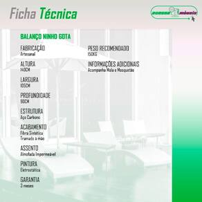 Independentemente de voce desejar criar um oasis de descanso em seu jardim, adicionar um toque especial a sua varanda ou proporcionar um local agradavel para relaxar em sua area externa ou escritorio, o Balanco Suspenso Ninho Gota e a escolha perfeita para voce. Experimente o conforto incomparavel, a elegancia duradoura e os beneficios revigorantes que o Balanco Suspenso Ninho Gota tem a oferecer.