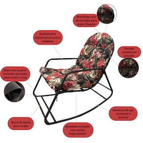 A Cadeira de Balanço que Une Conforto, Proteção e Estilo Descubra a combinação perfeita de conforto, elegância e funcionalidade com a nossa cadeira de balanço em junco sintético e almofada impermeável. Seu design anatômico se adapta ao corpo, enquanto a base reforçada com estrutura em aço garante segurança e estabilidade em cada balanço.