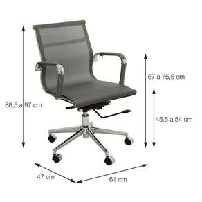 Especificações Técnicas: Cor: Cinza Peso: 14,4 kg Altura: 0,89m Comprimento: 0,47m Largura: 0,61m Ideal para uso: Interno Peso suportado: 120Kg Pode ser empilhada Não EAN: 7898599221769 Modelo: Eames Office Baixa Base: Rodízio Material: Assento em tela com estrutura cromada. Sistema relax com travamento. Base de encaixe metalizado. Rodas em PU que não danificam o piso Garantia: O produto possui garantia do fornecedor de 6 meses contra defeitos de fabricação a partir da emissão da nota fiscal.