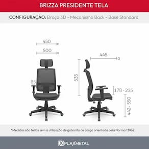 Precisando do Laudo NR-17 A gente entrega o suporte completo que você merece. Esse é um de nossos produtos que possui laudo ergonômico NR-17, essencial para comprovar que os itens atendem às normas de ergonomia exigidas pelo Ministério do Trabalho. E é somente nós solicitar após a compra que lhe enviamos. Diferente de muitos vendedores que não oferecem esse suporte, aqui você tem total segurança para equipar seu escritório com produtos certificados e evitar dores de cabeça. Por que esse laudo é tão importante Empresas podem ser fiscalizadas a qualquer momento, e a ausência do laudo pode gerar notificações, multas ou até mesmo processos trabalhistas vindo de colaboradores. Ter esse documento em mãos é um cuidado que demonstra seriedade e responsabilidade com a saúde dos colaboradores. Conte conosco para entregar mais que produtos - entregamos segurança, conformidade e tranquilidade. A harmonia perfeita entre versatilidade e leveza com um impressionante toque de elegância é o que nos encanta ao observar a Brizza Presidente. Toda a concepção da cadeira foi cuidadosamente pensada, a começar pelos rodízios. Nesta área as opções foram desenvolvidas justamente para se adaptarem aos diferentes tipos de piso, desde os mais irregulares até os mais lisos. Palavras de Vendedor: Modelo muito ergonômico e confortável, uma linha muito antiga portanto já provou para o mercado sua qualidade, diferente de um produto que é lançamento de poucos anos de venda. Esse modelo possui as regulagens de altura e inclinação do encosto que trazem uma maior ergonômia e adaptação para diversas biotipos e estaturas. Essa variação com base cromada que é muito bonita e chamativa, realmente quem pode gastar um pouco mais mas nem tanto para adquirir uma cadeira com base aluminio, recomendaria essa, mas realmente é somente estética, em relação a durabilidade os outros modelos de base não deixam nada a desejar. Como o modelo preto. Produto nacional fabricado pela Plaxmetal Peso Max. Recomendado: 135 kg Classificação: Giratória; Alta com apoio; Com base cromada Modelo: Nacional Base: Cromada Regulagem de Altura: Sim, com pistão classe 4. Com rodízios: Sim, com rodízios em PU anti-risco Com sapatas: Não se Aplica Mecanismo: backplax com regulagem de altura e inclinação do encosto. Regulagem de altura do Encosto: Sim Braços: Braços Reguláveis 3D em Polipropileno. não é mácio Medidas da Cadeira A x L x C : Medidas expressas na última foto do anuncio. Tipo de Revestimento: Sintético Café : de 05 Cinco anos, inclusos os 90 dias de legal, contra defeitos de fabricação na estrutura metálica e peças plasticas com função estrutural, coluna á gás possui 2 anos de sendo classe 4, e demais componentes possuem de 1 ano. a é concedida considerando uso por 8 horas de trabalho/dia por usuário com peso máximo de 110kg e respeitando totalmente as recomendações de uso, limpeza, conservação e segurança. Marca: Não Informado