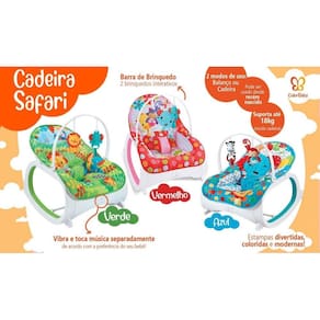 A cadeira safari da Collor baby, é a cadeira que vai garantir o conforto do seu bebê, ela foi projetada para entreter o bebê ao mesmo tempo que o tranquiliza e acalma, a cadeira vibra e toca música separadamente, possui estampas lindas e brinquedos super divertidos e podem ser usadas desde recém-nascidos.