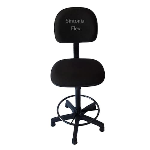 Cadeira caixa alta com aro com base sapata fixa pra mercado balcao recpçao tecido preto Cadeira caixa - aro para apoio dos pés - prolongador de altura - madeira reflorestada - espuma injetada revestida de tecido j. Serrano anti-chamas e bordas em pvc flexivel - pés fixo com sapatas. Altura do chão aom assento: Mínima 63 cm Máximo 75 cm Marca: Sintonia Flex