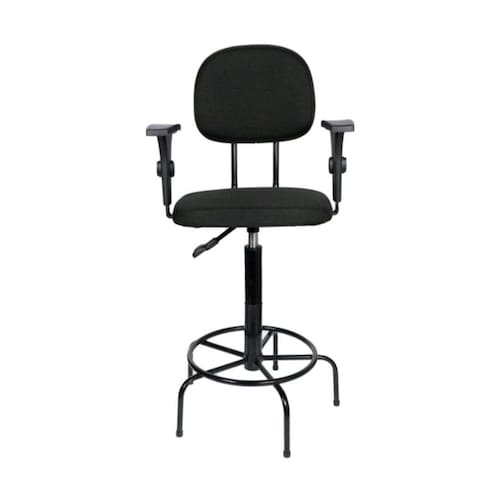 Cadeira caixa alta com braço - L duplo - regulagem de altura - base de ferro fixa tecido preto Cadeira secretaria caixa alta - braço com regulagem - apoio para os pés - estrela de ferro - espuma injetada - madeira reflorestada - bordas em pvc flexivel - revestido em tecido j. Serrano anti-chama - prolongador de altura