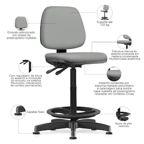 Com regulagem de altura do assento e inclinação do encosto via sistema Revolution (mecanismo de contato permanente).