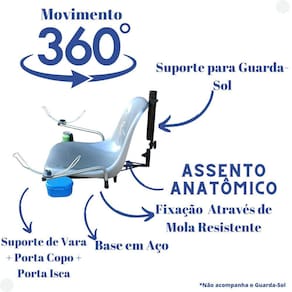 Principais Características: - Rotação 360°: Com o mecanismo giratório, você terá total liberdade de movimento, facilitando suas mudanças de direção e garantindo acesso rápido a todos os pontos de pesca ao redor do barco. - Design Tipo Concha: O assento em formato de concha proporciona excelente suporte para as costas e lombar, aliviando a pressão e evitando dores durante longas horas de pesca. - Assento anatômico: Proporciona maior conforto e segurança para sua pescaria, permitindo que você se concentre totalmente na pesca. - Durabilidade: Fabricada com materiais resistentes de polipropileno, essa cadeira é projetada para suportar as adversidades do ambiente marítimo. - Fácil Instalação: Seu sistema de fixação permite uma instalação rápida e segura em qualquer tipo de barco. - Diferencial: Cadeira com estrutura em aço e pintura eletrostática. Apresenta base giratória, permitindo movimentos de 360.º, facilitando sua pescaria. Observação: não acompanha guarda-sol. Acessórios: 02 suportes de varas reguláveis; 01 suporte para guarda-sol; 01 porta lata e 01 estojo de iscas na cor azul ou verde (cor variável conforme a disponibilidade de estoque). Observação: não acompanha guarda-sol. Aumente sua produtividade e satisfação nas pescarias com a Cadeira Giratória Tipo Concha para Barco de Pesca! Garanta momentos inesquecíveis e fisgadas perfeitas com todo o conforto que você merece.