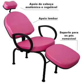 Cadeira Conforty para Maquiagem Cílios Sobrancelha unhas Para execução de vários procedimentos de estética e beleza, a For-ty Store lançou a Cadeira Multiuso para Procedimentos modelo Conforty. Com ela, você pode fazer serviços como maquiagem, cílios, sobrancelha, limpeza de pele, unhas, e demais procedimentos, mantendo máximo de conforto para cliente. É uma cadeira robusta, que tem inclinação e apoios corretos para variados serviços. Características: - Cor do estofado: Pink em Tecido Sintético Facto, o tecido Facto é resistente ao uso de Álcool 70 para limpeza e higienização. - Encosto de cabeça anatômico, com altura ajustável, que apoia a nuca, dando conforto para o cliente e a firmeza que o profissional precisa - Apoio lombar, para que seu cliente se sinta confortável pelo tempo que necessite para execução do procedimento - Apoio de pernas: além de deixar seu cliente relaxado, tem a altura certa para procedimentos nos pés e unhas dos pés. Pode ser removível - Apoio de braços em P.U., material resistente e com toque macio Medidas montada: 130cm x 63cm x 85cm Sem o apoio de pé: 90cm x 63cm x 85cm Medidas internas no assento: largura 49cm x Profundidade 48 cm Medidas internas do encosto: Largura 47,5cm x Altura 42cm Medida do assento ao chão: Parte incial do encosto 42cm x Parte final próximo ao apoio de pés 52cm Alturas do apoio de pés: Mínima 39,5 cm e Máxima 49 cm Medida da caixa: 68cm x 53cm x 54cmMedidas aproximadas, podendo haver pequenas variaçõesSuporta até 160Kg distribuídos Peso 19kg