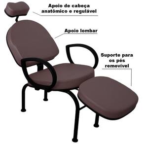 Características: - Cor do estofado: CAFÉ em Tecido Sintético Facto, o tecido Facto é resistente ao uso de Álcool 70 para limpeza e higienização - Encosto de cabeça anatômico, com altura ajustável, que apoia a nuca, dando conforto para o cliente e a firmeza que o profissional precisa - Apoio lombar, para que seu cliente se sinta confortável pelo tempo que necessite para execução do procedimento - Apoio de pernas: além de deixar seu cliente relaxado, tem a altura certa para procedimentos nos pés e unhas dos pés. Pode ser removível - Apoio de braços em P.U., material resistente e com toque macio - Cadeira de apoio para profissional, tipo mocho, para procedimentos onde o profissional pode executar sentado. Possui regulagem de altura e espuma injetada Medidas da cadeira: Medidas montada: 130cm x 63cm x 85cm Sem o apoio de pé: 90cm x 63cm x 85cm Medidas internas no assento: largura 49cm x Profundidade 48 cm Medidas internas do encosto: Largura 47,5cm x Altura 42cm Medida do assento ao chão: Parte próxima ao encosto 42cm x Parte próxima ao apoio de pés 52cm Alturas do apoio de pés: Mínima 39,5 cm e Máxima 49 cm Medidas aproximadas, podendo haver pequenas variações Suporta até 160Kg distribuídos Peso 19kg Medidas do mocho: Altura mínima 53cm e máxima 64cm Assento 38cm diâmetro Pentapé 53cm diâmetro Suporta até 120Kg distribuídos Todas as medidas são aproximadas podendo haver pequenas variações.