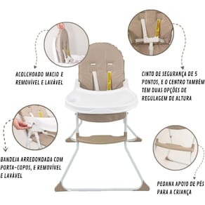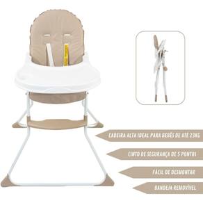 A Cadeira de Refeição é ideal para bebês até 23 Kg. Dispõe assento, encosto e laterais acolchoados em plástico laminado sendo mais confortável e muito fácil de limpar, cinto 5 pontos que garante a segurança dos pais e das crianças.