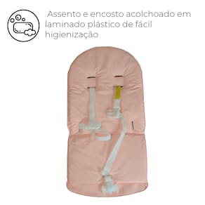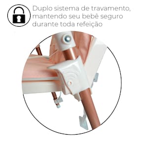 Além disso, o assento e o encosto são acolchoados em laminado plástico de fácil higienização, o que torna a limpeza muito mais fácil após as refeições. A cadeira também conta com um apoio para os pés, bandeja removível com porta copos e um duplo sistema de travamento para maior segurança.