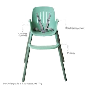 Características: - Para crianças de 6 a 36 meses, até 15 Kg - Bandeja removível - Design moderno - Pedana - Cinto de segurança de 5 pontos - Retentor entrepernas - Pés antiderrapantes - Sobrebandeja removível - Estrutura tubular garante estabilidade, além de permitir o empilhamento - Desmontável