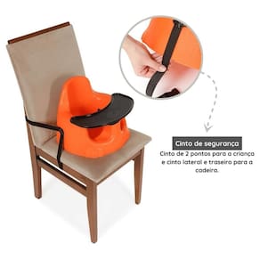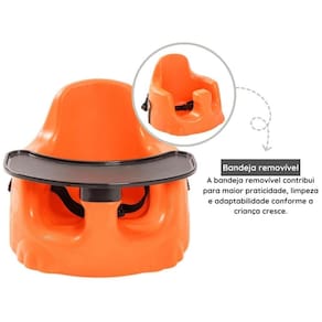 Características Técnicas: Idade recomendada: 3 meses como assento de chão e 6 meses como cadeira de refeição Peso máximo suportado: 15 kg Cor: laranja Composição: Estrutura em Poliuretano PU e bandeja em Polipropileno Cinto de 2 pontos para a criança e cinto lateral e traseiro para a cadeira Com uma espuma super macia e formato anatômico, garantindo o máximo de conforto para as crianças Possui bandeja de alimentação que pode ser facilmente retirada Seu formato impede que acumule sujeira naqueles cantinhos difíceis de limpar e tem um irresistível cheirinho de tutti fruti