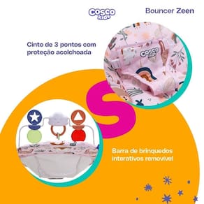 O Bouncer Zeen da Cosco é a escolha adorável e prática para proporcionar ao seu bebê um lugar seguro e estimulante onde possa relaxar e explorar. Criado para momentos em que os pais precisam de uma mãozinha extra, este bouncer combina conforto, entretenimento e praticidade.