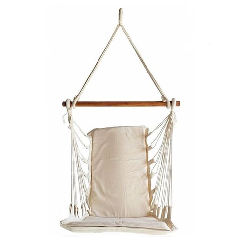 Cor: Cru Que tal uma cadeira suspensa que você possa levar e instalar em Praticamente todos os lugares aonde forem como sacadas, Varandas, parques, acampamentos, em casa, quintal, etc., pois, pode ser Pendurada em vigas, lajes, arvores, telhados ou em qualquer lugar que tenha A altura e suporte o peso recomendado.