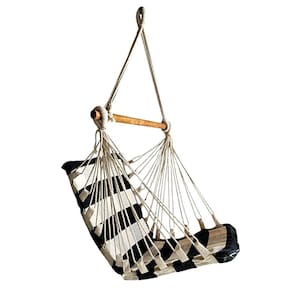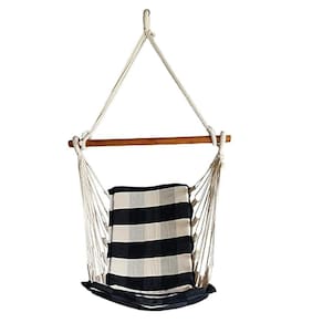 Cor: Preto com branco xadrez Que tal uma cadeira suspensa que você possa levar e instalar em Praticamente todos os lugares aonde forem como sacadas, Varandas, parques, acampamentos, em casa, quintal, etc., pois, pode ser Pendurada em vigas, lajes, arvores, telhados ou em qualquer lugar que tenha A altura e suporte o peso recomendado.