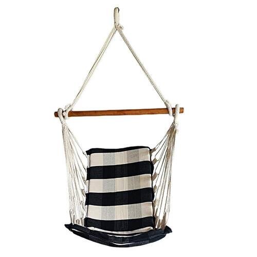 Cor: Preto com branco xadrez Que tal uma cadeira suspensa que você possa levar e instalar em Praticamente todos os lugares aonde forem como sacadas, Varandas, parques, acampamentos, em casa, quintal, etc., pois, pode ser Pendurada em vigas, lajes, arvores, telhados ou em qualquer lugar que tenha A altura e suporte o peso recomendado.