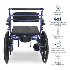 Assento mais largo com largura de 51 cm de largura A única da categoria que suporta até 200 kg Seu assento é impermeável, acolchoado e rebatível o que proporciona conforto e facilidade na limpeza 4 em 1 - Perfeita para transporte interno, banho, sobre vaso e higiene Leve e fácil de manusear devido ao baixo peso, apenas 19,2 kg Freio estacionário bilateral, garantindo total controle e segurança