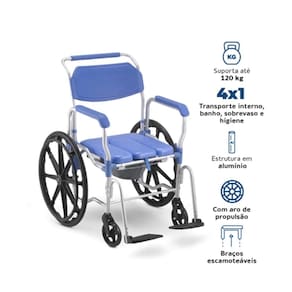 -4 em 1 Transporte interno, banho, sobrevaso e higiene; -Suporta até 150 Kg; -74,5 cm de largura total da cadeira de banho; -Rodízios 360 que permitem mobilidade total em ambientes com espaço reduzido.