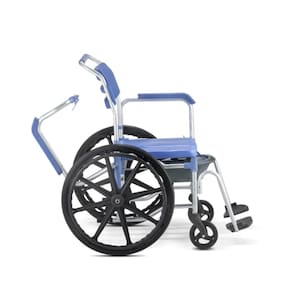 -O produto conta com rodas com aro de propulsão de 24 polegadas para maior mobilidade; -Possui assento com meio vazado retrátil para facilitar a utilização da comadre que acompanha o produto; -Sua estrutura acompanha um trilho que facilita a remoção da comadre; -A pintura epóxi garante maior durabilidade contra ferrugem e tem por finalidade aumentar a vida útil do produto; -Capacidade: 150 Kg; -Composição: Alumínio e Polipropileno; -Estrutura desmontável; -Largura total de 74,5 cm; -Estrutura cinza com acabamentos em azul; -Apoio de braço flexível e acolchoado.