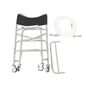 Incluso: Cadeira de Banho D40 Dobrada, Assento Sanitário com Barra, Estofamento do Encosto, Suporte do Encosto, Apoio de Pé e Manual