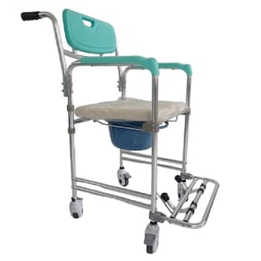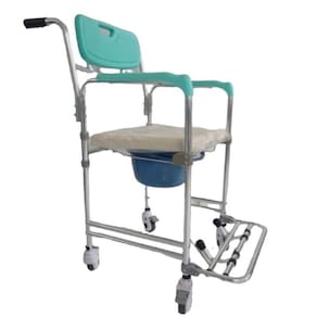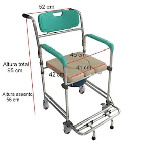 Produto: cadeira de banho higiênica Fabricante: zimedical Indicada para uso interno Composição: alumínio. Rodizio de 5 polegadas. Altura do assento: 56 cm Peso: aprox. 9 kg