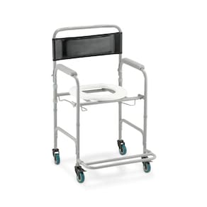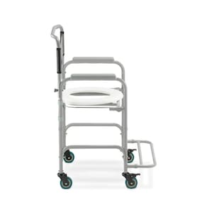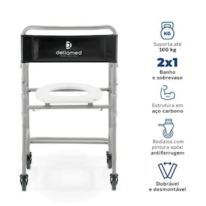 -Suporta até 100kg; -Dois em um: banho e sobre vaso; -Estrutura em aço carbono, oferecendo maior robustez e durabilidade; -Rodízios 360º permitem mobilidade total em ambientes com espaço reduzido; -Largura do assento de 44cm; -Estrutura inferior soldada para maior resistência e estabilidade; -Melhor custo-benefício.