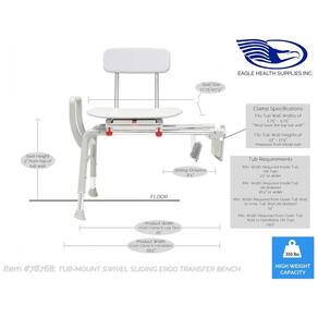 Tamanho do assento: 45 cm x 44,5 cm. Altura do assento: 12,7 cm acima da borda da banheira. Comprimento da base: 63,5 cm - 75 cm. Distância de deslizamento: 21,5 cm. Capacidade de peso: 158 kg.