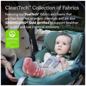 Para conforto adicional, o Aria possui um painel traseiro com ventilação para fluxo de ar, mantendo o bebê fresco e confortável. Os tecidos são removíveis e laváveis à máquina, garantindo praticidade na limpeza. Todos os materiais são livres de retardantes de fogo e certificados pela FAA para uso em aeronaves.