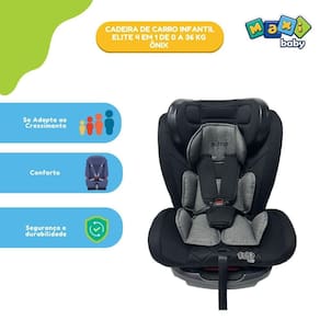 Cadeira de Carro Infantil Elite 0-36Kg Ônix Cinza Maxi Baby A cadeira Elite da Maxi Baby é uma cadeira para auto completa que irá atender todas as fases do seu filho, desde o nascimento até aproximadamente os 10 anos de idade, onde ele já estará pronto para o assento do veículo, não sendo necessário mais nenhuma cadeira de elevação. Possuí almofada removível para fácil lavagem, cinto de segurança de 5 pontos com ajuste de altura para os ombros em até 2 posições, reclinável em até 4 posições. Durante os primeiros meses do bebê, a cadeira Elite é instalada contra o movimento podendo estar nessa posição até 10kgs. Após 10kgs ela deverá ser fixada a favor do movimento e possui 4 opções de recline para melhor conforto da criança.