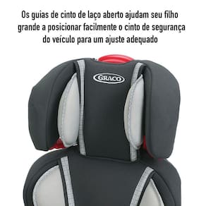 Sistema latch com uma mão e ajuste frontal protege o impulsionador ao assento do veículo. As guias de cinto de alça aberta ajudam a posicionar corretamente o cinto de segurança do seu veículo para permitir a auto-afivelamento independente.