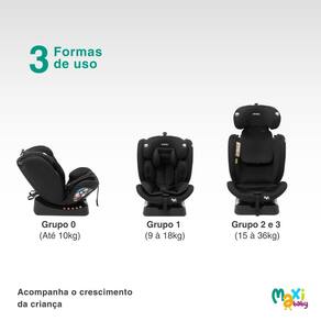 - No Grupo 2 e 3 indicado de (15 à 36kg) – O dispositivo deve ser instalado de frente ao movimento, removendo a almofada redutora, e ajustando a altura do apoio de cabeça, utilizando o cinto de segurança do veículo.