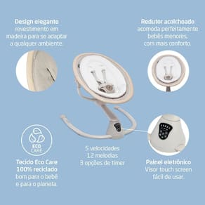Visor Touchscreen: Com controles intuitivos, oferece 2 direções de balanço, 5 velocidades e 15 melodias relaxantes para ajustar conforme a preferência do bebê.