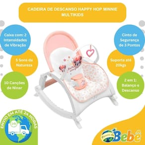 Cadeira de Descanso e Balanço Para Bebê Com Canção de Ninar Minnie - Multikids A Cadeira Happy Hop Minnie da Multikids é a opção ideal para proporcionar ao seu bebê momentos de descanso e diversão. Com um design inovador e funcional, ela é 2 em 1, podendo ser utilizada tanto no modo balanço quanto no modo cadeira de descanso, adaptando-se às necessidades do seu pequeno. Com recursos pensados para o bem-estar do bebê, ela conta com 2 brinquedos interativos que estimulam o desenvolvimento, além de um módulo musical com 10 canções de ninar e 5 sons da natureza. A função de vibração, com duas intensidades, também contribui para o relaxamento do bebê, criando um ambiente mais tranquilo e acolhedor. Seu cinto de segurança de 3 pontos, com protetor entrepernas, garante que o bebê fique sempre bem acomodado e protegido. Já o encosto acolchoado oferece 2 posições de recline, proporcionando ainda mais conforto para o pequeno. Sua estrutura leve e resistente torna o uso mais prático, enquanto os pés retráteis permitem alternar facilmente entre as funções de balanço e descanso. Outro destaque é o seu arco interativo removível e a sua estrutura dobrável, que facilita seu armazenamento e seu transporte, tornando-a perfeita para diferentes ambientes e levando ainda mais diversão para o pequeno em qualquer lugar. Aprovada pelo Inmetro, a Cadeira Happy Hop é ideal para acompanhar o crescimento do seu bebê com conforto e segurança. Principais Características: - Idade Recomendada do Nascimento até 3 Anos - Peso Máximo Suportado: 20kgs - Modelo: Happy Hop Minnie - Possui 10 Canções de Ninar e 5 Sons da Natureza - Central de Controle com 2 Ajustes de Volume - Função Vibração com 2 Intensidades - Estrutura com Fechamento Dobrável Compacto - Encosto com 2 Posições de Recline - Pés Retráteis para Uso na Função Balanço ou Descanso - Cinto de Segurança de 3 Pontos - Possui Protetor Entrepernas - Encosto Confortável Acolchoado - Estrutura Leve e Resistente - Possui 2 Brinquedinhos Interativos - Arco Interativo Removível - Necessário 4 Pilhas AA Não Inclusas - Aprovado pelo Inmetro Especificações Técnicas: - Conteúdo da Embalagem: 1 Cadeira de Descanso Happy Hop Minnie - Multikids - Dimensões do Produto Aberto AxLxP : 45,5 x 49,0 x 61,0cm - Dimensões do Produto Fechado AxLxP : 62,0 x 49,0 x 61,0cm - Composição/Material: Polipropileno, Poliéster e Ferro - Alimentação: 4 Pilhas AA Não Inclusas - Peso: 3,000kgs - : 90 dias Contra Defeitos de Fabricação Pelo Fabricante - Certificação: Inmetro 001678/2022 - Código do Fabricante: BB482 - EAN: 7908842809276 - Marca: Multikids Imagens Meramente Ilustrativas. As cores e estampas podem variar de acordo com o lote do fabricante.