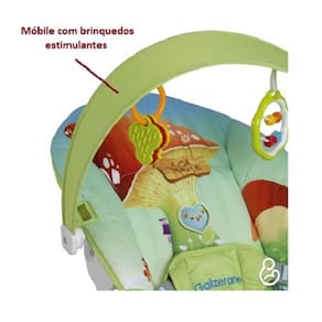 A Cadeira de descanso Galzerano foi desenvolvida com todo carinho e pensando no desenvolvimento do bebê. Ela é toda acolchoada e com uma inclinação ideal que deixa o bebê em posição confortável. Seu arco contém brinquedos que estimulam o tato e a visão. E a caixinha de música aguça a audição e ainda emiti uma vibração suave que acalma o bebê. O cinto de segurança de 3 pontos tem um revestimento acolchoado para ficar ainda mais confortável. O bebê se balança com o próprio movimento.