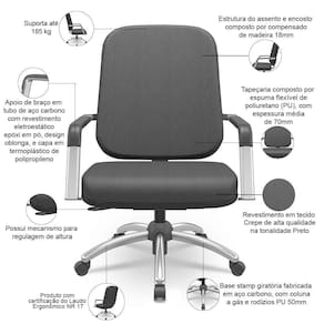 Color: Preto | ColorSupplier: Preto | MaterialFamily: Crepe | ProductWeight: 25 kg | Com aro para pés: Não | ProductWidth: 71 cm | Tipo de cadeira de escritório: Cadeira Giratória Operativa Plus Size | Modelo: Magno | Cor: Preto | Formato de venda: Unitário | Material do estofamento: Crepe | Com rodas: Sim | Com apoio de braços: Sim | OriginCountry: Brasil | Model: Magno | Número de registrocertificação INMETRO: ABNT NBR 13962, NR 17 | ColorFamily: Preto | ColorSimple: Preto | Material: Base Giratória de Aço Carbono, Espuma Flexível Poliuretano, Crepe | Requer montagem: Sim | ProductHeight: 115 cm | SupplierSimpleName: Cadeira de Escritório Giratória com Braço Cromada Magno P03 Crepe Preto - Lyam Decor | Modelo detalhado: Magno Giratória Base Cromada | OriginState: PR | SizeDescription: Altura: 115 cm x Largura: 71 cm x Profundidade: 73 cm | ProductWarranty: 90 dias após o recebimento do produto | ProductInstructions: Produto para uso em ambiente interno, nao devendo ficar exposto ao sol, calor e umidade excessivos. | Materiais do aro para pés: na | ProductLength: 73 cm | ProductContents: 01 Cadeira Giratória, manual de instruções