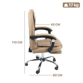 Especificações Cor: Caqui Revestimento: Couro sintético resistente e elegante Apoio para os pés retrátil: permite relaxar as pernas com praticidade Encosto reclinável: ajustável entre 90° e 150°, ideal para aliviar a tensão nas costas Estrutura: armação metálica robusta com espuma de alta densidade para suporte prolongado Capacidade de carga: até 150 kg, com base giratória e rodízios silenciosos de 360° Dimensões do Produto Embalado: 69 x 26 x 58 cm (AxLxC) Dimensões do Produto: 95 x 45 x 43 cm (AxLxC)