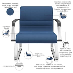 Modelo detalhado: Lev com Braços Base Cromada | ColorSupplier: Azul | Color: Azul | de registrocertificação INMETRO: ABNT NBR 13962, ABNT ABNT NM 300, NR 17 | Com aro para pés: Não | ProductContents: 01 Cadeira, manual de instruções | ProductHeight: 82 cm | Modelo: Lev | Tipo de cadeira de escritório: Cadeira Recepção, Sala de Espera | Model: Lev | Material: Tubo de Aço Carbono, Espuma ível Poliuretano, Crepe | ProductInstructions: Produto para uso em ambiente interno, nao devendo ficar exposto ao sol, calor e umidade excessivos. | Material do estofamento: Crepe | ColorSimple: Azul | Com apoio de braços: Sim | OriginCountry: | OriginState: PR | ProductWidth: 77 cm | SizeDescription: Altura: 82 cm x Largura: 77 cm x Profundidade: 66 cm | Cor: Azul | Materiais do aro para pés: na | Com rodas: Não | ProductWarranty: 90 dias após o do produto | ProductWeight: 15 kg | Formato de venda: Unitário | ColorFamily: Azul | Requer montagem: Sim | MaterialFamily: Crepe | SupplierSimpleName: Cadeira de Escritório Recepção com Braço Fixa Cromada Lev P03 Crepe Azul - Lyam Decor | ProductLength: 66 cm