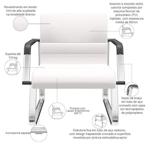 OriginState: PR | Modelo: Lev | Model: Lev | OriginCountry: | Material do estofamento: Vinil | Formato de venda: Unitário | ColorSupplier: Branco | Requer montagem: Sim | Tipo de cadeira de escritório: Cadeira Recepção, Sala de Espera | Com aro para pés: Não | Materiais do aro para pés: na | Com rodas: Não | ProductWeight: 15 kg | SizeDescription: Altura: 82 cm x Largura: 77 cm x Profundidade: 66 cm | Modelo detalhado: Lev com Braços Base Cromada | ColorSimple: Branco | Com apoio de braços: Sim | MaterialFamily: Vinil | ProductWarranty: 90 dias após o do produto | ColorFamily: Branco | Color: Branco | Material: Tubo de Aço Carbono, Espuma ível Poliuretano, Vinil | ProductWidth: 77 cm | ProductHeight: 82 cm | de registrocertificação INMETRO: ABNT NBR 13962, ABNT ABNT NM 300, NR 17 | ProductInstructions: Produto para uso em ambiente interno, nao devendo ficar exposto ao sol, calor e umidade excessivos. | ProductContents: 01 Cadeira, manual de instruções | ProductLength: 66 cm | Cor: Branco | SupplierSimpleName: Cadeira de Escritório Recepção com Braço Fixa Cromada Lev P03 Vinil Branco - Lyam Decor