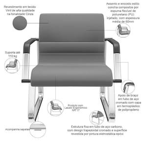 Formato de venda: Unitário | Cor: Cinza | Model: Lev | Materiais do aro para pés: na | ProductHeight: 82 cm | Modelo: Lev | ColorFamily: Cinza | de registrocertificação INMETRO: ABNT NBR 13962, ABNT ABNT NM 300, NR 17 | Material: Tubo de Aço Carbono, Espuma ível Poliuretano, Vinil | ProductWidth: 77 cm | Tipo de cadeira de escritório: Cadeira Recepção, Sala de Espera | Com apoio de braços: Sim | Com aro para pés: Não | Com rodas: Não | ColorSupplier: Cinza | Color: Cinza | OriginCountry: | MaterialFamily: Vinil | ProductWeight: 15 kg | ProductLength: 66 cm | ProductWarranty: 90 dias após o do produto | Material do estofamento: Vinil | ProductInstructions: Produto para uso em ambiente interno, nao devendo ficar exposto ao sol, calor e umidade excessivos. | SupplierSimpleName: Cadeira de Escritório Recepção com Braço Fixa Cromada Lev P03 Vinil Cinza - Lyam Decor | Modelo detalhado: Lev com Braços Base Cromada | ColorSimple: Cinza | Requer montagem: Sim | OriginState: PR | ProductContents: 01 Cadeira, manual de instruções | SizeDescription: Altura: 82 cm x Largura: 77 cm x Profundidade: 66 cm