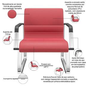 Color: Vermelho | Modelo detalhado: Lev com Braços Base Cromada | Com aro para pés: Não | Cor: Vermelho | Tipo de cadeira de escritório: Cadeira Recepção, Sala de Espera | Formato de venda: Unitário | Model: Lev | Material do estofamento: Vinil | ProductWeight: 15 kg | ProductContents: 01 Cadeira, manual de instruções | MaterialFamily: Vinil | OriginCountry: | Modelo: Lev | ColorSimple: Vermelho | ColorSupplier: Vermelho | Requer montagem: Sim | SizeDescription: Altura: 82 cm x Largura: 77 cm x Profundidade: 66 cm | ProductWidth: 77 cm | ColorFamily: Vermelho | Com apoio de braços: Sim | Com rodas: Não | OriginState: PR | SupplierSimpleName: Cadeira de Escritório Recepção com Braço Fixa Cromada Lev P03 Vinil Vermelho - Lyam Decor | ProductHeight: 82 cm | Materiais do aro para pés: na | de registrocertificação INMETRO: ABNT NBR 13962, ABNT ABNT NM 300, NR 17 | ProductWarranty: 90 dias após o do produto | ProductInstructions: Produto para uso em ambiente interno, nao devendo ficar exposto ao sol, calor e umidade excessivos. | Material: Tubo de Aço Carbono, Espuma ível Poliuretano, Vinil | ProductLength: 66 cm