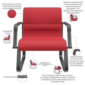 ColorFamily: Vermelho | Material: Tubo de Aço Carbono, Espuma ível Poliuretano, Crepe | Material do estofamento: Crepe | Materiais do aro para pés: na | Com rodas: Não | de registrocertificação INMETRO: ABNT NBR 13962, ABNT ABNT NM 300, NR 17 | OriginCountry: | OriginState: PR | ColorSupplier: Vermelho | Modelo: Lev | Color: Vermelho | Formato de venda: Unitário | SizeDescription: Altura: 82 cm x Largura: 77 cm x Profundidade: 66 cm | ProductInstructions: Produto para uso em ambiente interno, nao devendo ficar exposto ao sol, calor e umidade excessivos. | ProductHeight: 82 cm | SupplierSimpleName: Cadeira de Escritório Recepção com Braço Fixa Preta Lev P03 Crepe Vermelho - Lyam Decor | ProductLength: 66 cm | Modelo detalhado: Lev com Braços Base Preta | MaterialFamily: Crepe | ProductContents: 01 Cadeira, manual de instruções | ProductWidth: 77 cm | ProductWarranty: 90 dias após o do produto | ProductWeight: 15 kg | Model: Lev | Cor: Vermelho | Tipo de cadeira de escritório: Cadeira Recepção, Sala de Espera | Com aro para pés: Não | ColorSimple: Vermelho | Com apoio de braços: Sim | Requer montagem: Sim