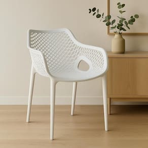 O desenho vazado dá leveza visual e um toque contemporâneo ao ambiente. As linhas contínuas formam concha única com braços integrados e bordas arredondadas, criando uma peça fluida que combina facilmente com mesas redondas ou retangulares e com diferentes estilos de decoração.