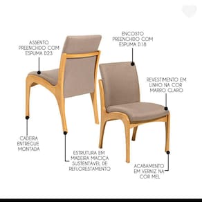 A Cadeira Lisboa vai se tornar a protagonista no seu ambiente. Dispõe de um design atual, petindo montar diversas composições e agregar na decoração e conforto. Podem ser utilizadas em mesas de jantar, apoio extra na sala de estar, complementar ambientes ou onde você precisar. A Cadeira Lisboa é produzida com materiais de excelente qualidade, garantindo sua durabilidade e vida útil.    CARACTERÍSTICAS TÉCNICAS: - Produzida em Madeira Maciça - Acabamento em Verniz na cor Mel  - Assento Estofado Preenchido com Espuma D23 - Encosto Estofado Preenchido com Espuma D18 - Revestimento em Tecido Linho na cor Marrom Claro L87 - Cadeira Entregue Montada   INFORMAÇÕES TÉCNICAS: Altura Total: 90 cm Altura Chão + Assento: 50 cm Altura Encosto: 44 cm Largura Total: 52 cm Largura Assento: 60 cm Profundidade Total: 60 cm Profundidade Assento: 56 cm Peso: 8 kg    INFORMAÇÕES ADICIONAIS: Garantia para defeitos de fabricação conforme Código de Defesa do Consumidor. *Não nos responsabilizamos por subir ou içar o produto. **As imagens ambientadas são meramente ilustrativas e podem apresentar itens que não compõe o produto, as cores do produto podem variar de acordo com o monitor, a iluminação do ambiente ou sua percepção visual.  ***Limpeza: Deve ser feita com pano macio e seco ou levemente umedecido com água e sabão neutro. Não devem ser utilizados abrasivos.